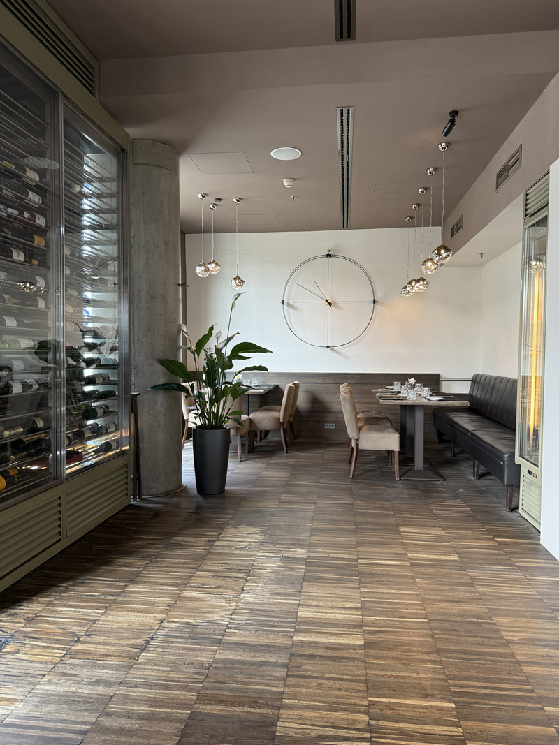 Nepostradatelným prvkem interiéru je vinný humidor hrající barevnými odlesky skvělých vín, který strhne Vaše oči k důkladnějšímu prozkoumání. A na jaký doplněk jsou majitelé nejvíce pyšní? Tím jsou dominantní designové hodiny Delmori od výrobce NOMON. Ale ať už Vás v naší restauraci zaujme po stránce designu cokoliv, je pro nás nejdůležitější Vaše spokojenost z gastronomického zážitku, který stojí na našem menu a umu našich zkušených kuchařů a celkový příjemný vjem ze strávené chvíle u nás, což dotváří profesionální personál a prostředí.