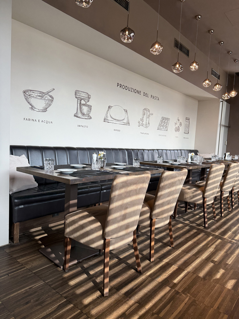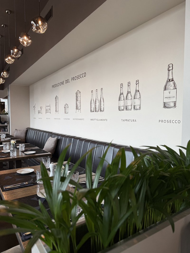 Od roku 2009, kdy návrh interiérového designu restaurace Ristorante Prosecco vytvořila architektka Barbora Vančurová, se vzhled nijak výrazně nezměnil. Ačkoliv byl interiér stále nadčasový, v lednu 2026 se současní majitelé rozhodli k rozsáhlé rekonstrukci, která zachovala příjemný, útulný dojem i rozložení vybavení restaurace, avšak vnesla moderní vizáž díky barevné změně zdí, nábytku pro personál a čalounění židlí. Naprostou originalitu vytvořili grafici/malíři svými obrázky popisujícími výrobu prosecca a těstovin a montáží charakteristického loga pod barovým pultem. Takovou třešničku na dortu dotvořila nová skleněná svítidla s trochou fantazie připomínající vinné bobule.